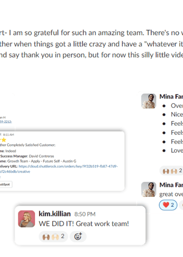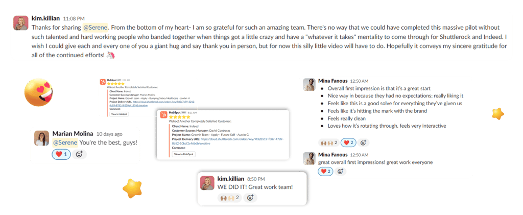 The CS team relayed the clients' enthusiastic feedback, along with heartfelt messages of appreciation for our hard work on the huge Indeed project. The clients were not only satisfied with our creative output but were also inspired to continue investing in new brand team campaigns with Shuttlerock.