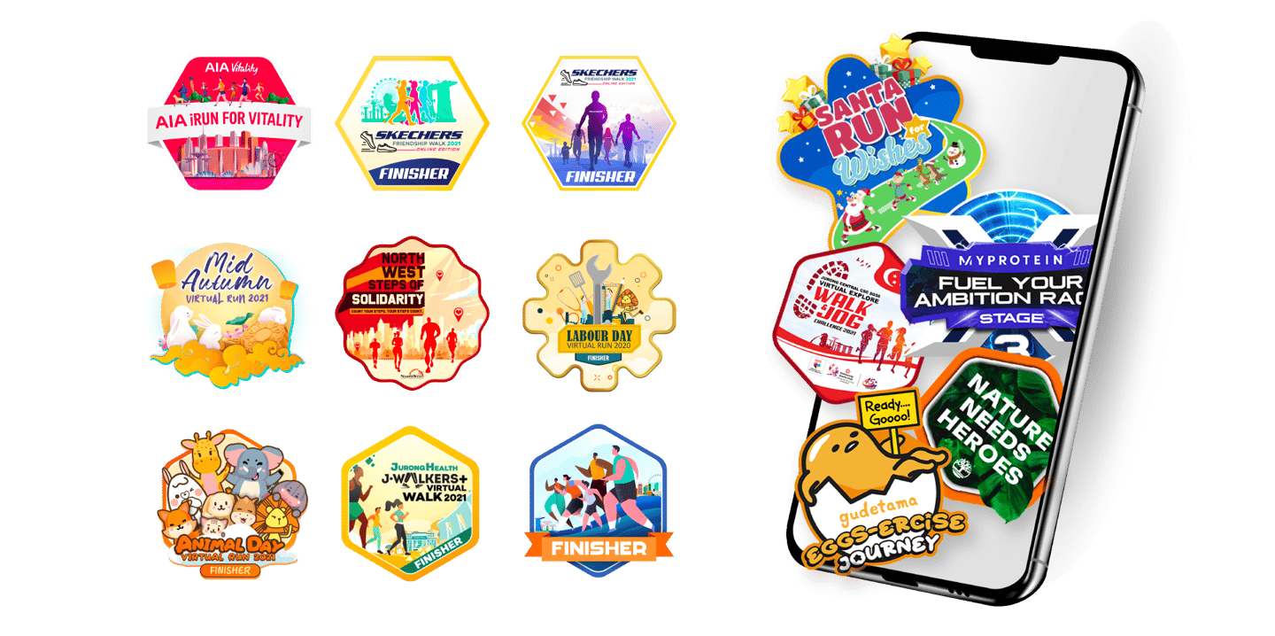LEO and FIFI serve as the visual icons of movement — LEO representing running and FIFI symbolising walking. I designed a series of themed e-badges featuring these two mascots across 12 monthly races, creating a consistent and engaging reward system that celebrates participation and progress.