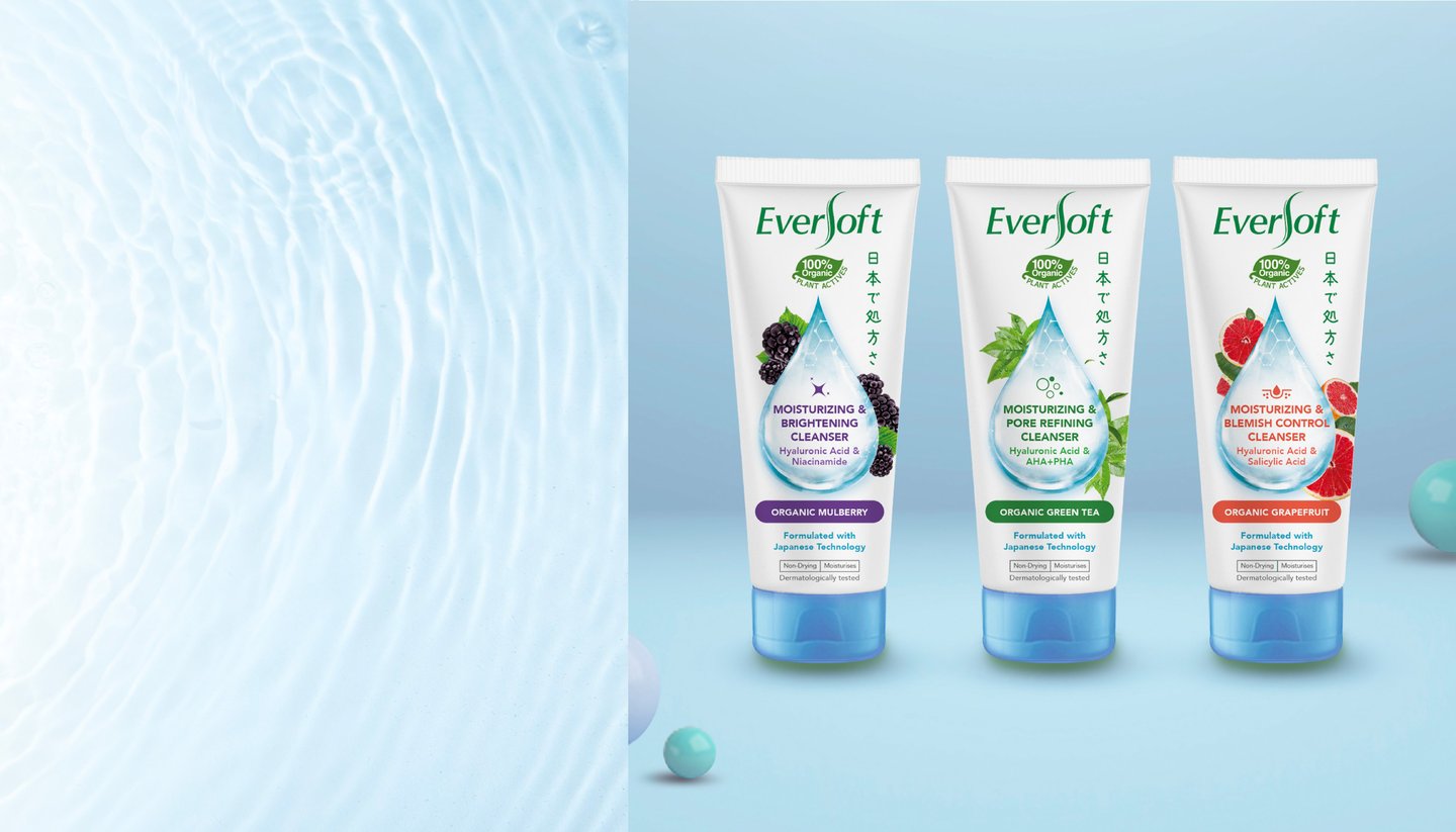 Translucent dew drop with subtle graphics at centreground and organic ingredients as backdrop, evoking a rich watery feel that corresponds to the product’s function of nourishment and moisturisation.
