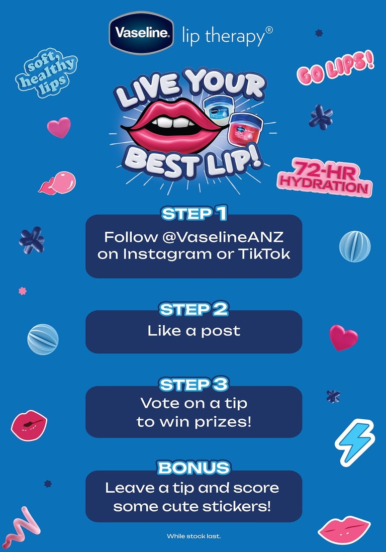 To celebrate the new university term, the Vaseline Lip Therapy activation campaign rolled out across three major campuses UNSW, USYD, and UOA engaging over 10,000 students with a fun, feel-good experience centered around self-care and lip hydration.