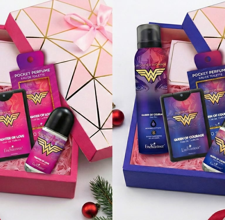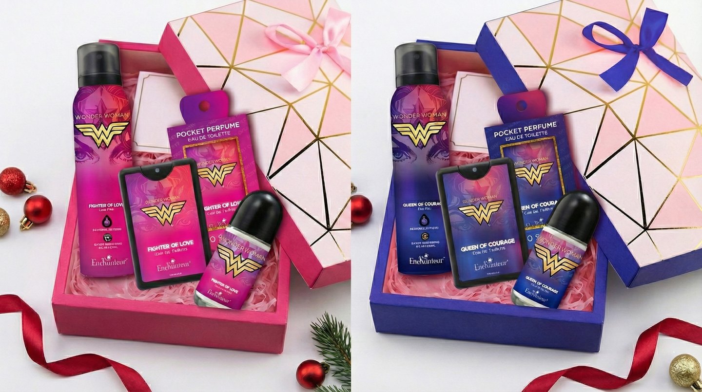 This collaboration unites Enchanteur’s romantic femininity with Wonder Woman’s strength and courage celebrating confidence as both softness and power.
