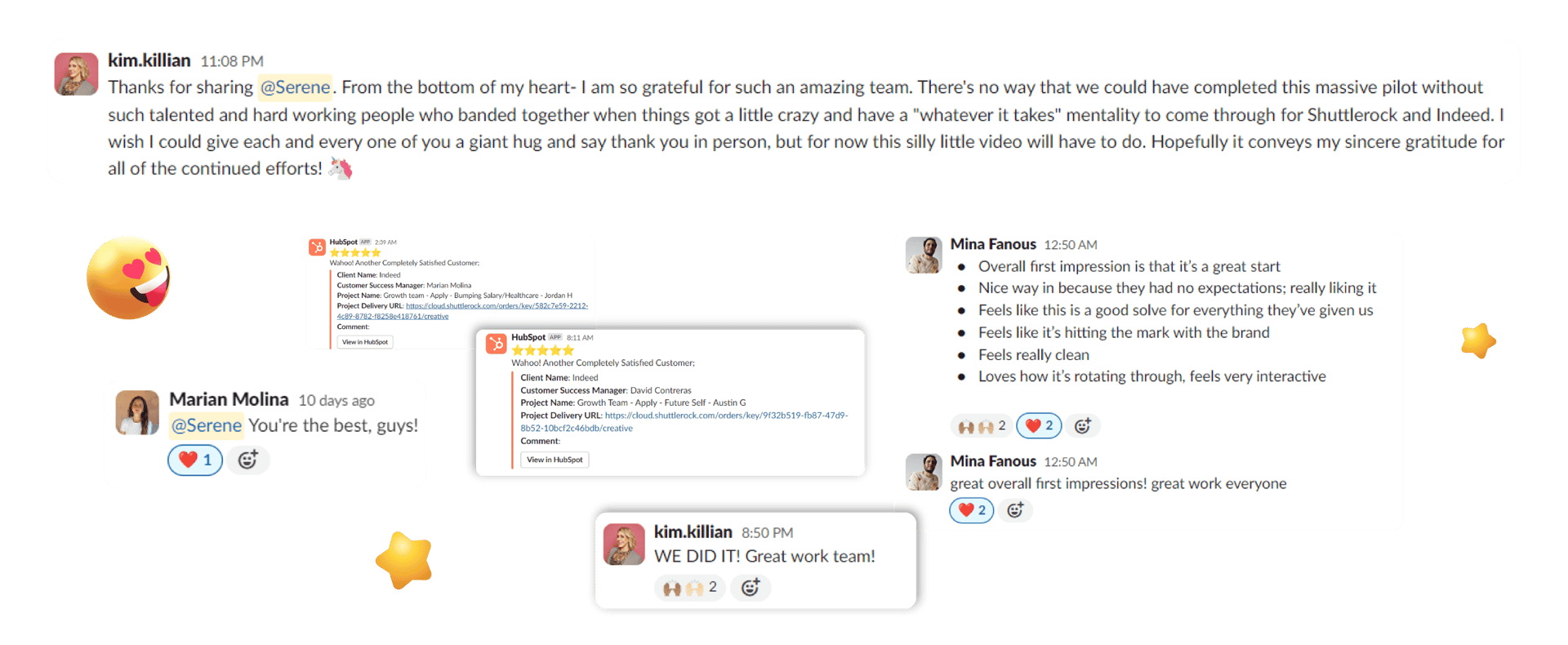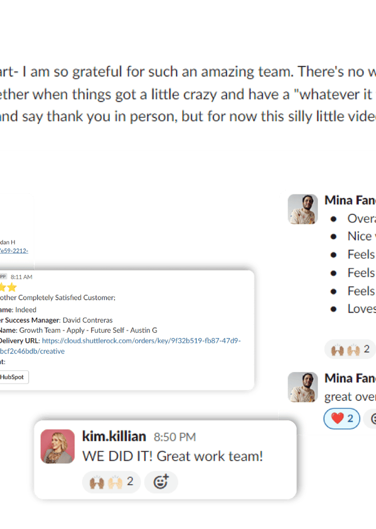 The CS team relayed the clients' enthusiastic feedback, along with heartfelt messages of appreciation for our hard work on the huge Indeed project. The clients were not only satisfied with our creative output but were also inspired to continue investing in new brand team campaigns with Shuttlerock.