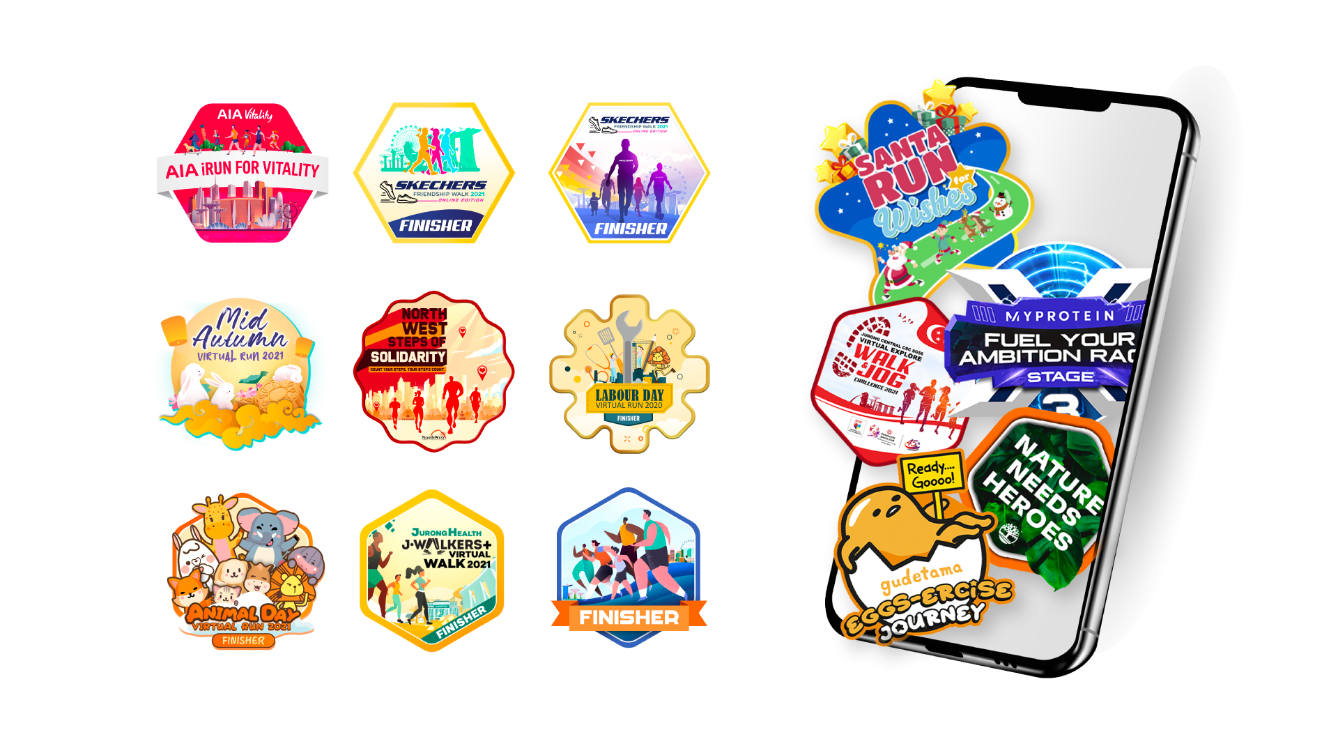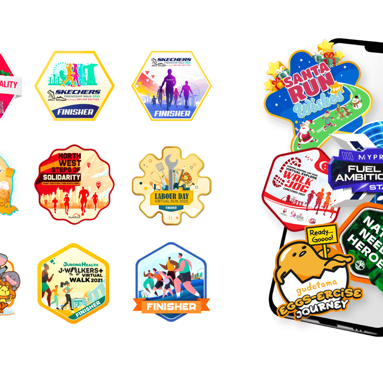 LEO and FIFI serve as the visual icons of movement — LEO representing running and FIFI symbolising walking. I designed a series of themed e-badges featuring these two mascots across 12 monthly races, creating a consistent and engaging reward system that celebrates participation and progress.